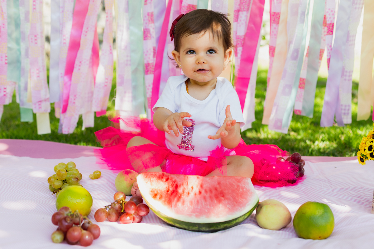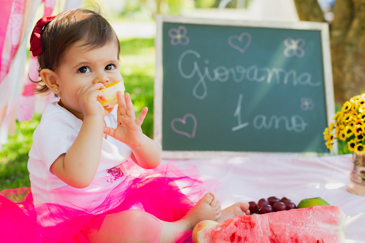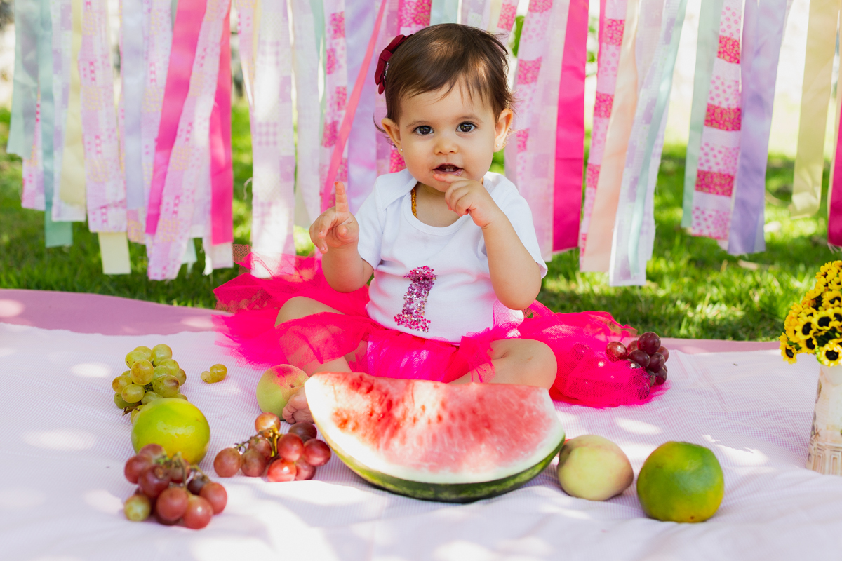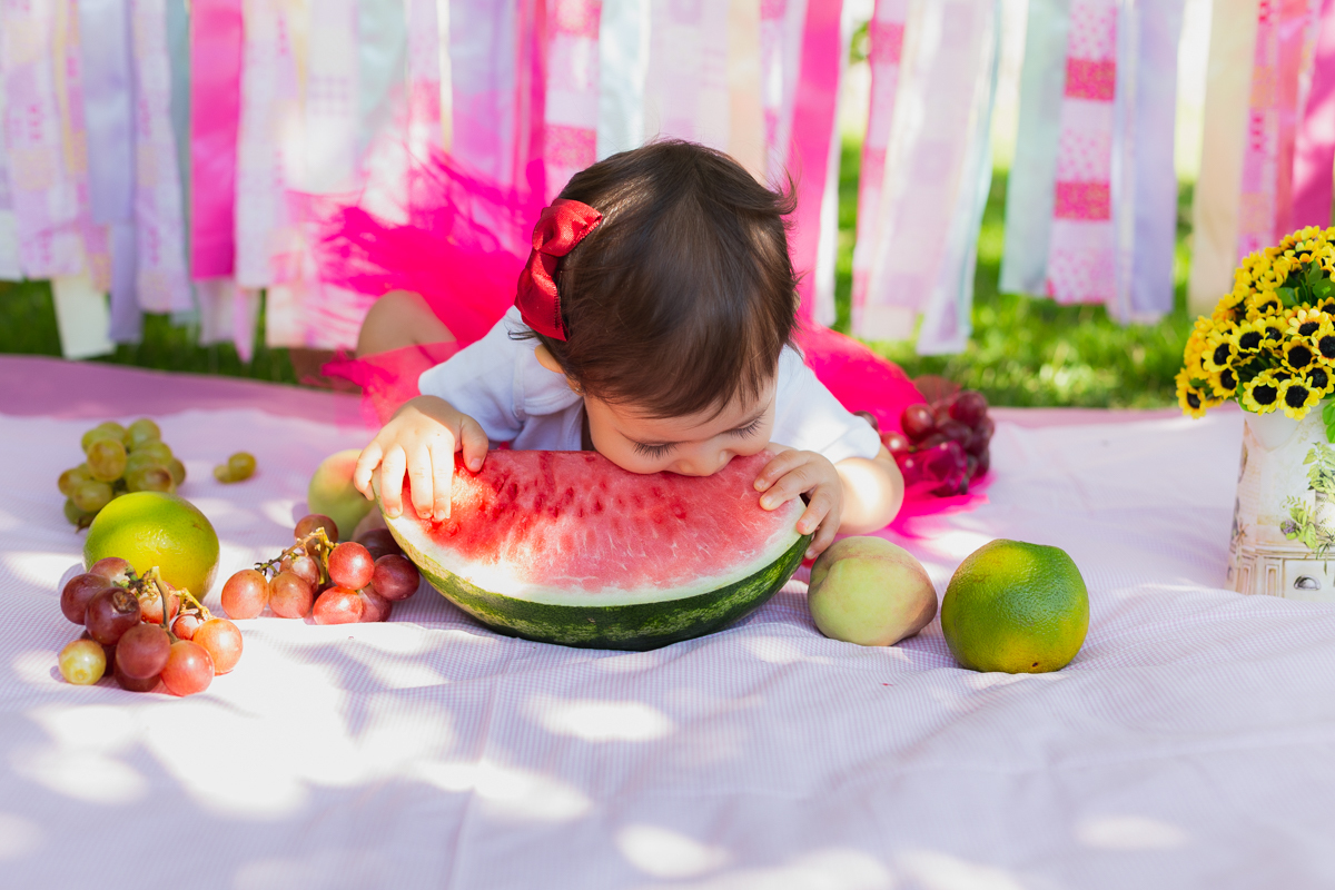 E como não podia deixar de ser a mamãe Nati optou por fazer o ensaio Smash The Fruit, pois ela ainda não estava oferecendo doces a Gigi; apenas as frutas. E nem preciso dizer que a pequena amou né!