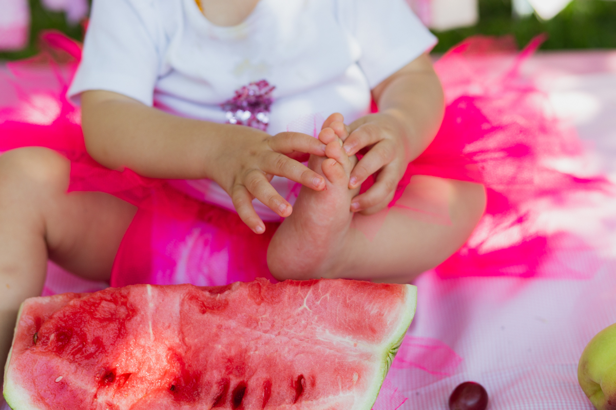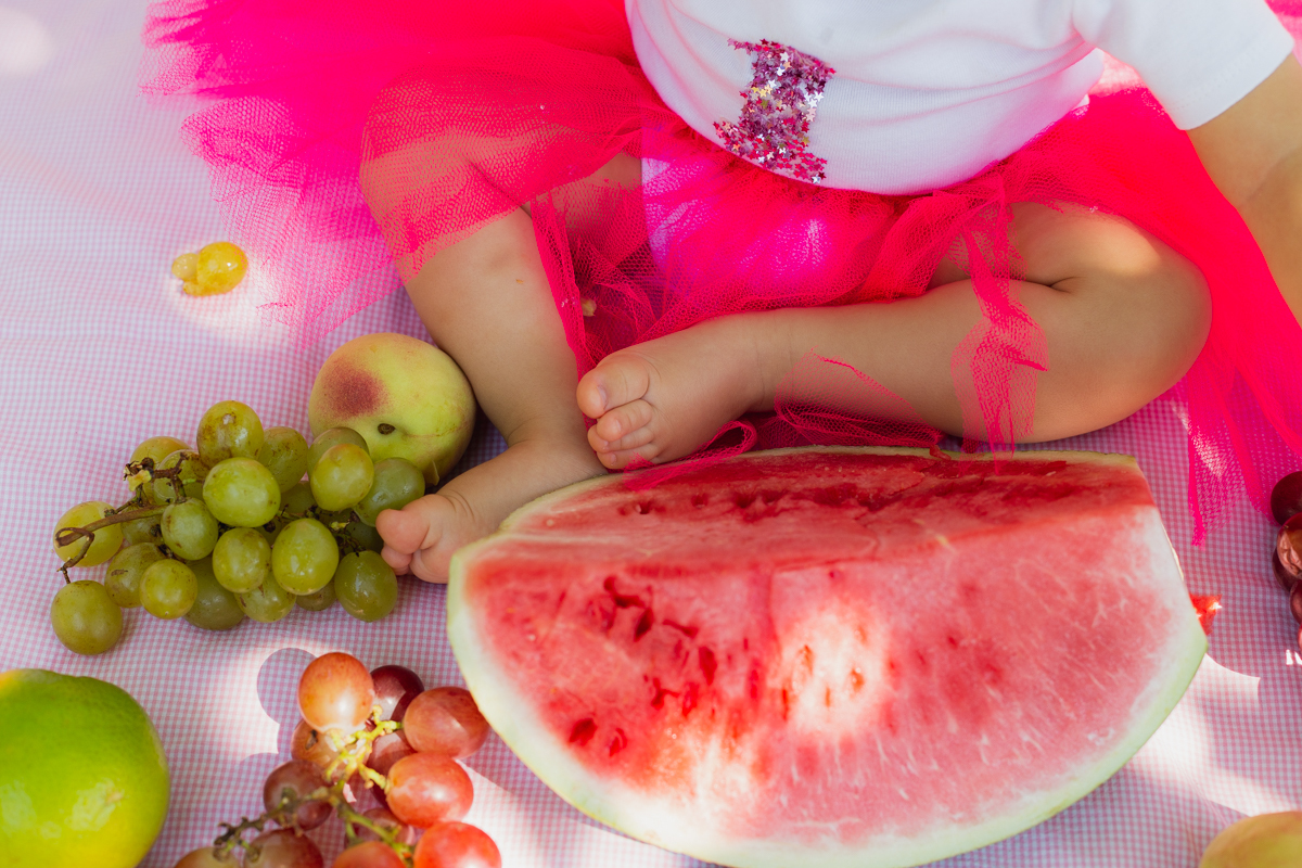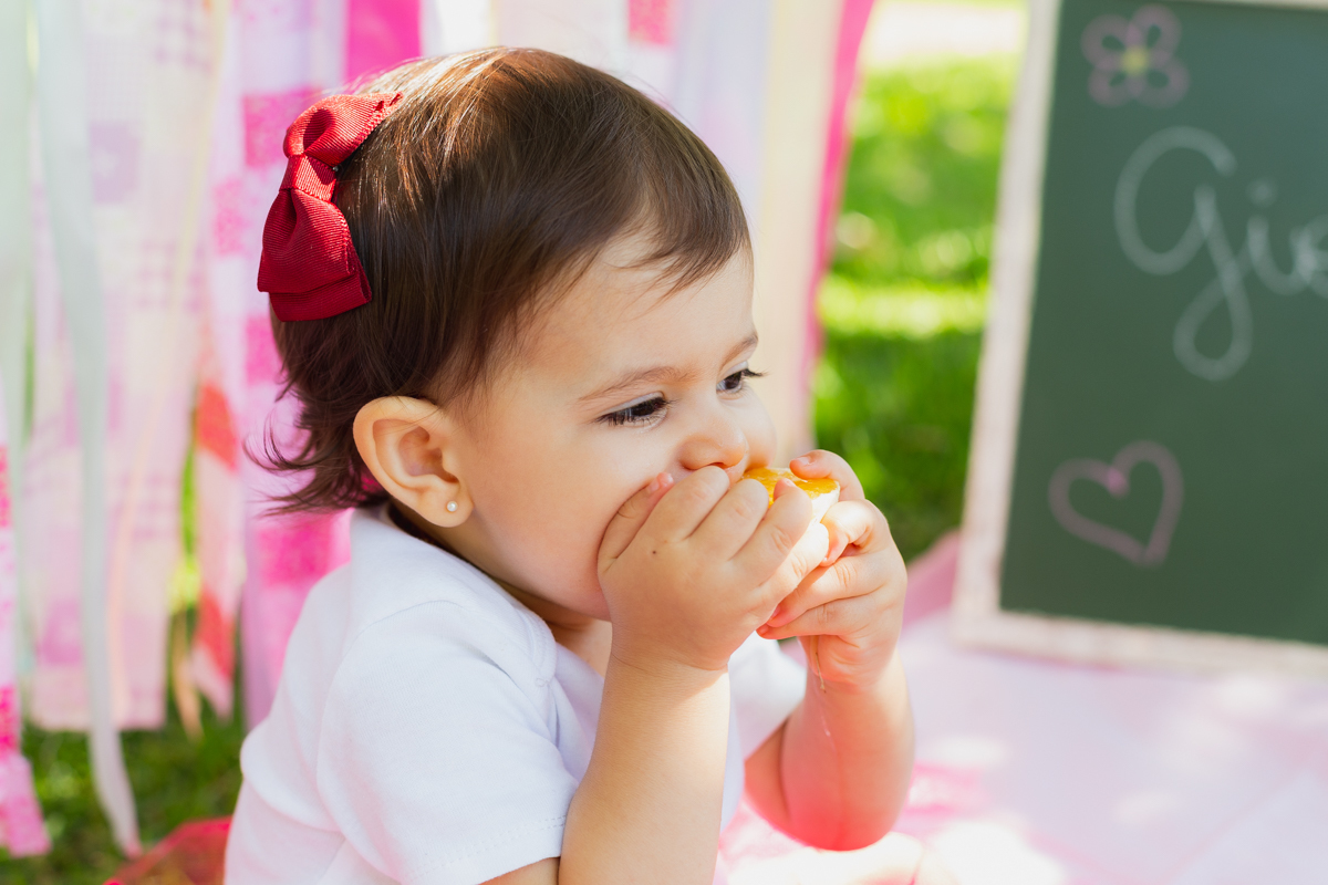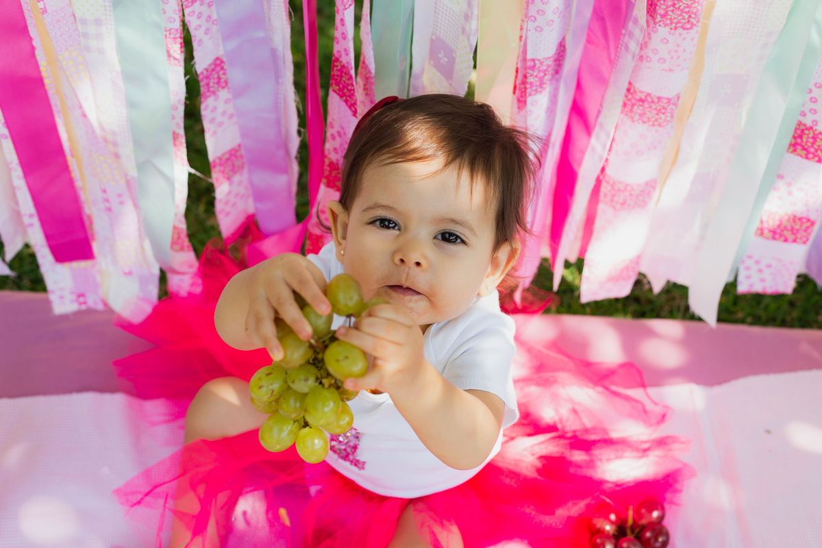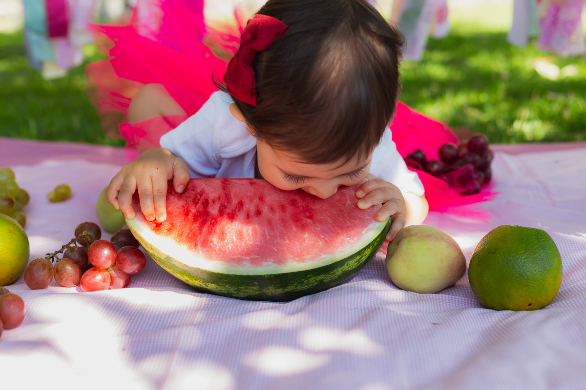 E como não podia deixar de ser a mamãe Nati optou por fazer o ensaio Smash The Fruit, pois ela ainda não estava oferecendo doces a Gigi; apenas as frutas. E nem preciso dizer que a pequena amou né!