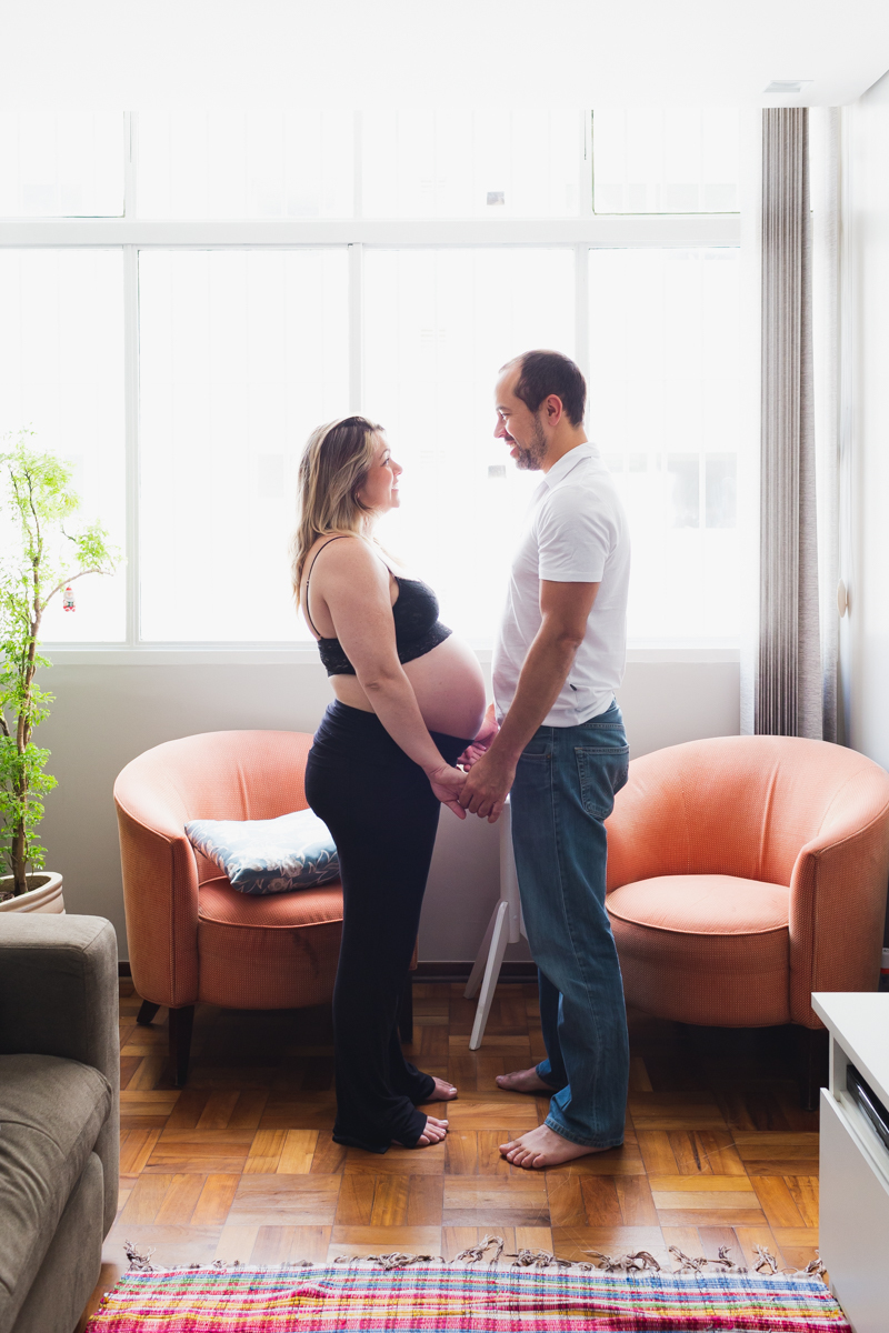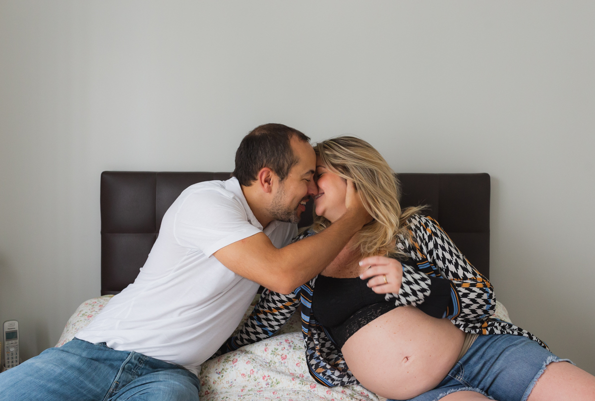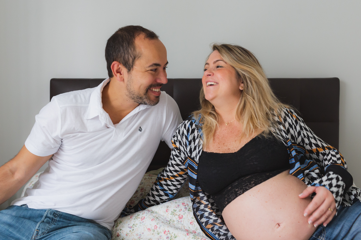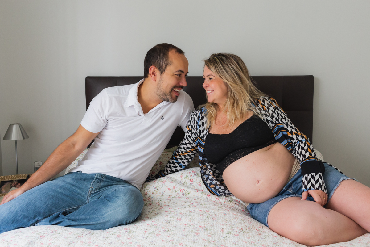 A mamãe e o papai estavam muito contentes, sorridentes e se divertiram! Quando o ensaio é realizado em casa, num formato Lifestyle o casal costuma ficar mais a vontade e a sessão de fotos fluí de forma ainda mais leve e tranquila!
