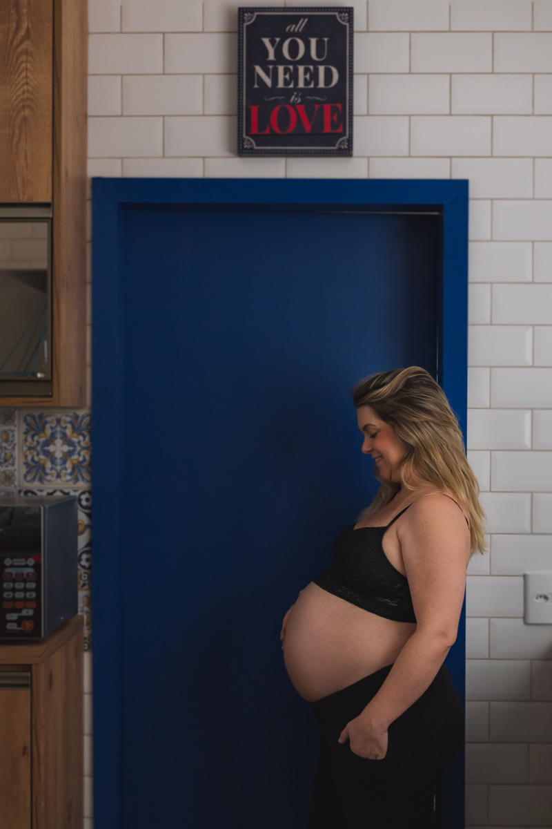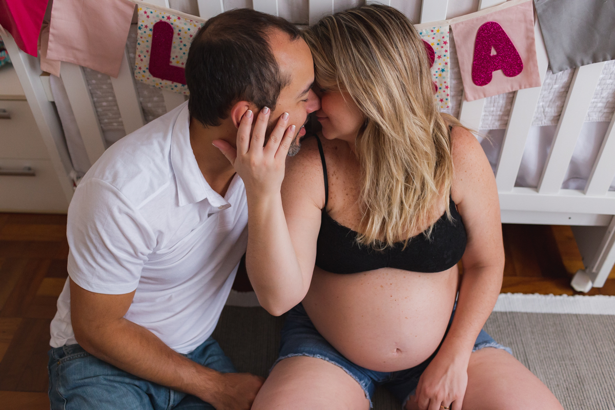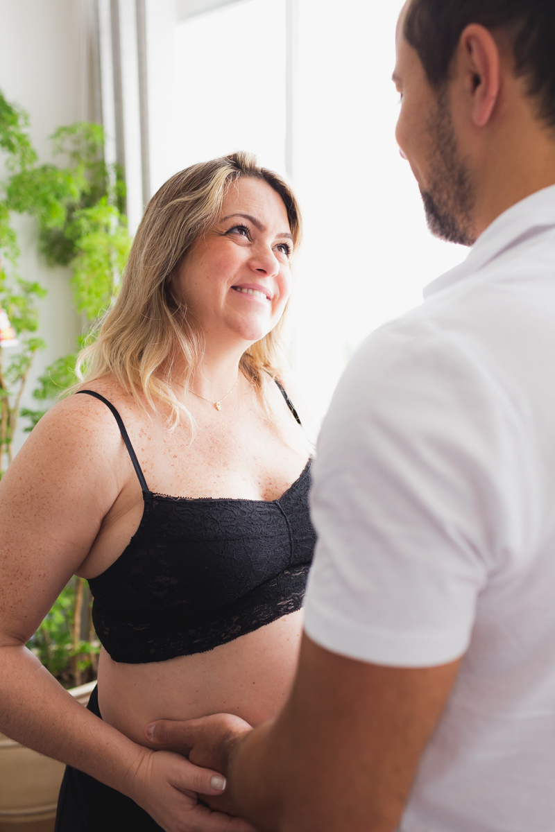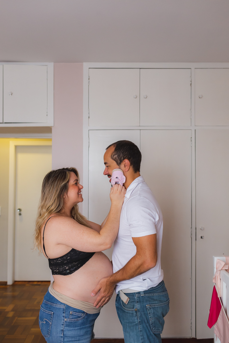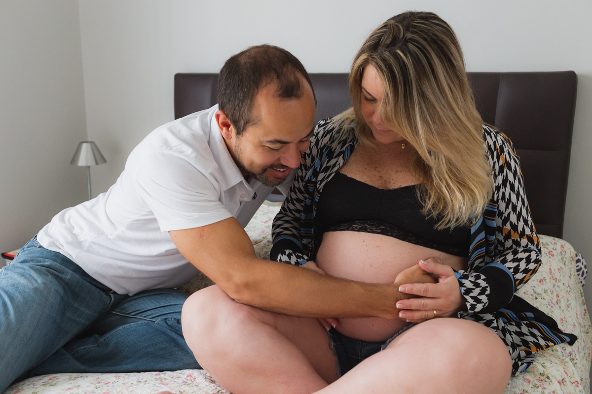 A mamãe e o papai estavam muito contentes, sorridentes e se divertiram! Quando o ensaio é realizado em casa, num formato Lifestyle o casal costuma ficar mais a vontade e a sessão de fotos fluí de forma ainda mais leve e tranquila!